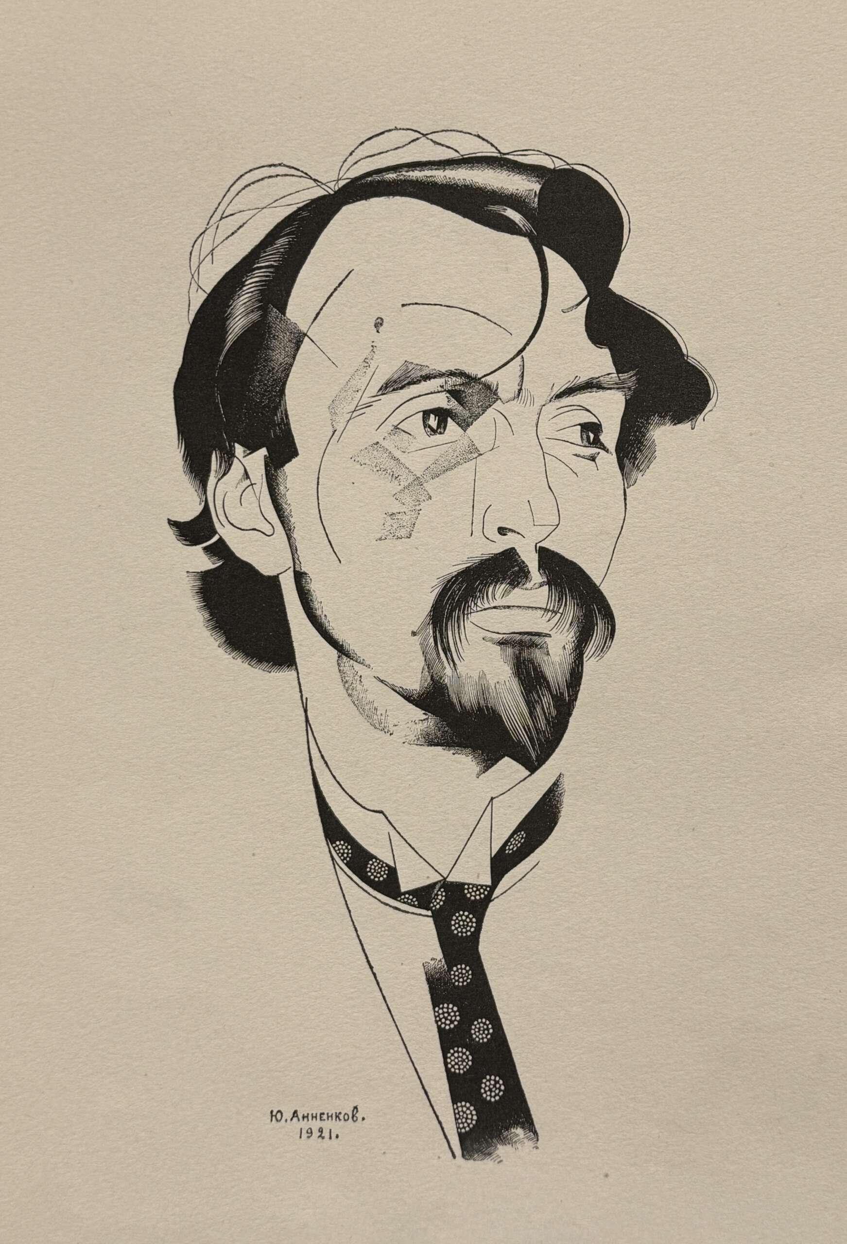 Портреты Юрия Анненкова – вероятно, самое значительное, что создал художник, это Золотой фонд русской графики! Они написаны в кубистическом стиле, что несомненно придаёт им некий конструктивистский шарм. При том, что прием Анненкова всегда обнажен в своей условности, возникает поразительный эффект живой жизни, которой живут его персонажи. За отвлеченностью штрихов, путаницей линий, гранями растушёвок возникает ощущение человеческой неповторимости, выразившейся здесь полностью и абсолютно, предельной психологической убедительности.Одним из художественных приемов Юрия Анненкова в графике являлось контрастное использование черного и белого пятен. Причем пятно часто ограничивается лишь тонкой контурной линией, не имея какой-либо прорисовки в границах контура.